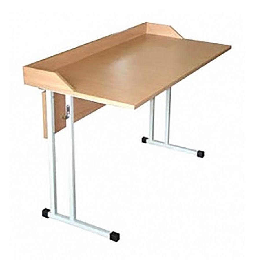 Стол ученический двухместный, не регулируемый по высоте, серого цвета с бортиком и двумя крючками.