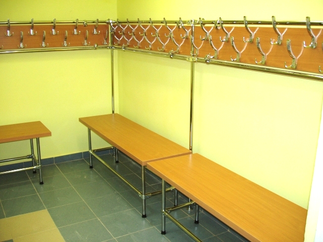 Вешалки настенные для раздевалок изготавливаются из сварной стальной хромированной трубы и панели ЛДСП. Скамейки в состав гардероба не входят.