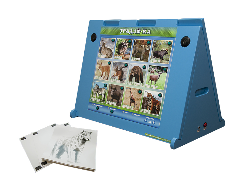 Учебное оборудование представляет собой двухстороннюю информационную панель с интерактивными светоиндикационными кнопками, на которой с обеих сторон представлено по 12 изображений диких животных.