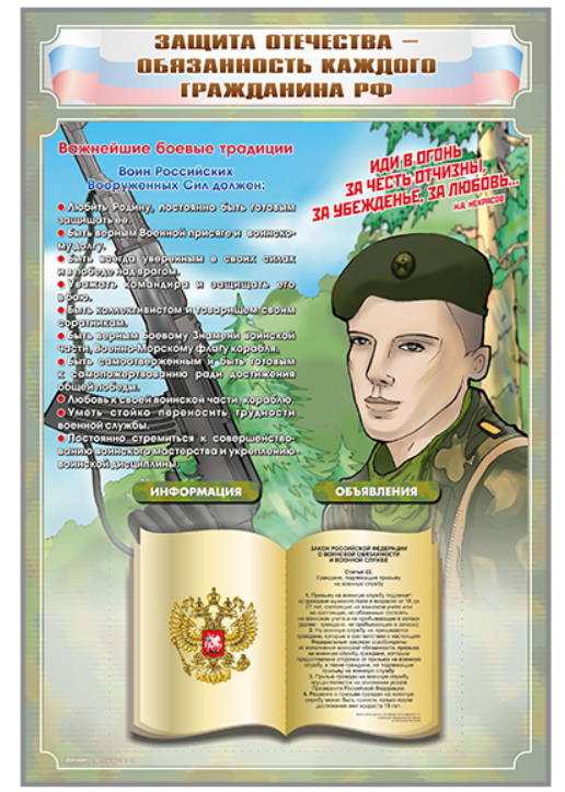 Стенд-уголок предназначен для наглядного размещения информации о главных боевых традициях защитников Родины и выдержки из Федерального закона "О воинской обязанности и военной службе", а также для формирования у учащихся или курсантов патриотического сознания.