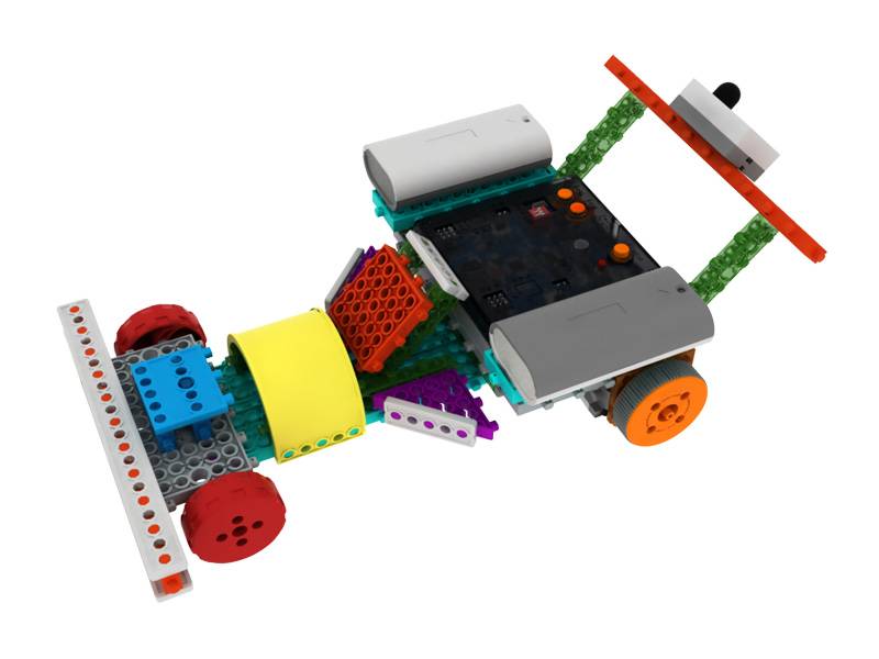 Набор состоит из не менее чем из 325 деталей, в т.ч. 1 материнская плата прошитая, 1 кейс для батарее 6 V, 3 ИК сенсоров, 1 RC приемника, 2 сенсора касания, 1 звуковой колонки, 1 пульта управления, 2 DC двигателя и 2 иллюстрированныe брошюры по сборке на СD-диске. В комплекте также вы найдете удобный пластиковый кейс-органайзер.