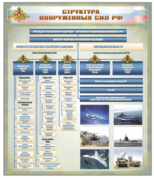 Стенд представляет собой информационную панель, на которой размещена структура Вооруженных сил РФ.